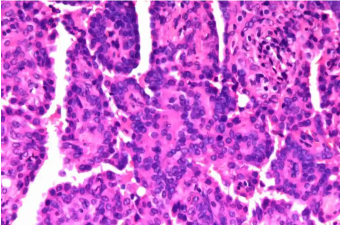 10月11日,肖女士被推进手术室。切除的标本被迅速送至病理科---被称作医院“法官”的地方,这里的每一个术中诊断都关乎着一台手术的走向,一个患者的未来。面对这份高度怀疑恶性的病例,病理科团队迅速启动了快速诊断流程。接诊后不到十分钟,一张优质的术中冰冻切片已交到了诊断医师手中。面对切片,诊断医师们有点犹豫不决了,明确的占位,不典型增生的细胞,良性?恶性?他们迅速查找资料,组织科内讨论,结合影像学及临床病史,最后告知手术团队,考虑肺乳头状腺瘤,最终诊断待常规及免疫组化结果,手术暂不扩大。