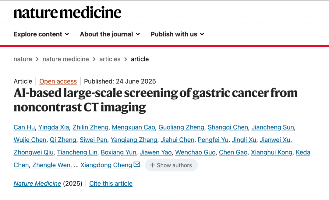 这是首次利用平扫CT影像识别早期胃癌病灶,意味着今后可以像做肺结节筛查一样进行胃癌筛查。该AI模型让基于影像的胃癌筛查首次成为可能,相关成果登上国际顶级期刊《自然·医学》(Nature Medicine)。