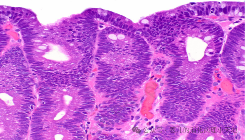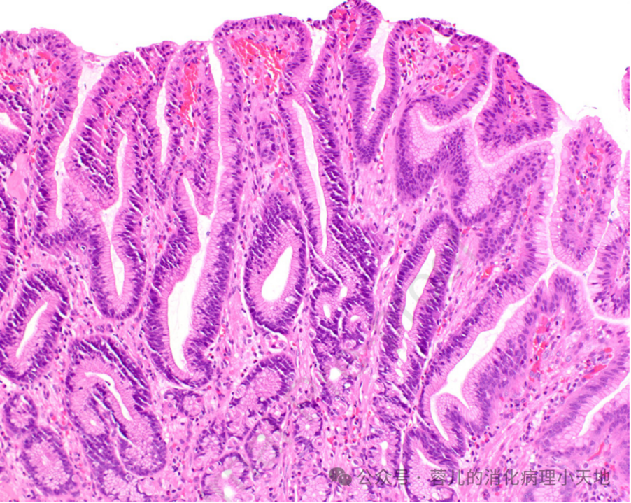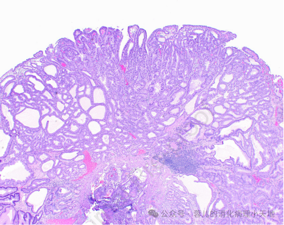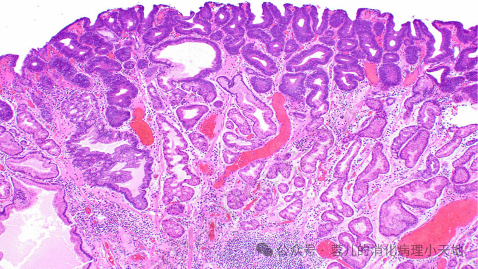 发病背景:多见于未感染幽门螺杆菌的患者,或家族性腺瘤性息肉病(FAP)、胃腺癌和胃近端息肉病(GAPPS,FAP变体)患者的息肉表面