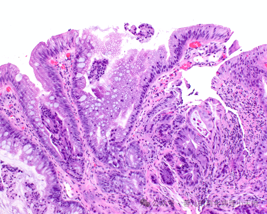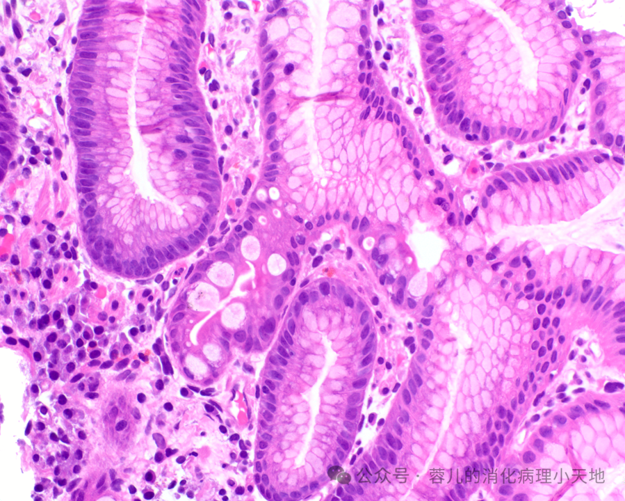 完全型肠上皮化生(CIM):完全重现小肠黏膜结构,杯状细胞与带完整刷状缘的吸收细胞交错分布,潘氏细胞可能存在