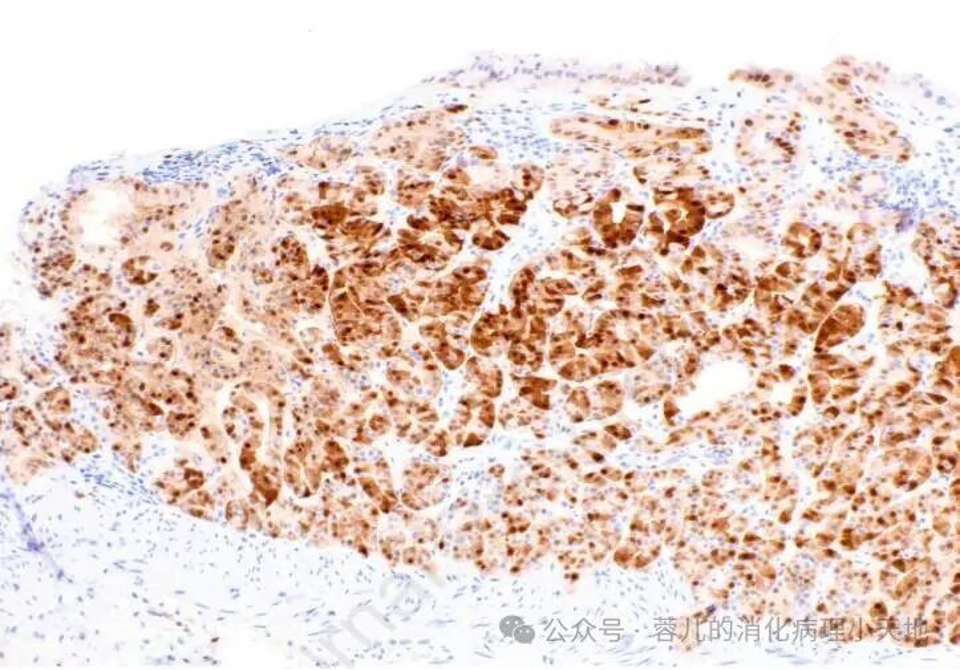 组织学+免疫表型:由黏膜表层下成角腺体组成,表现为主细胞分化、壁细胞分化或两者兼有;表达MUC6但不表达MUC5AC,Cyclin D1弥漫阳性,可作为疑难病例确诊依据