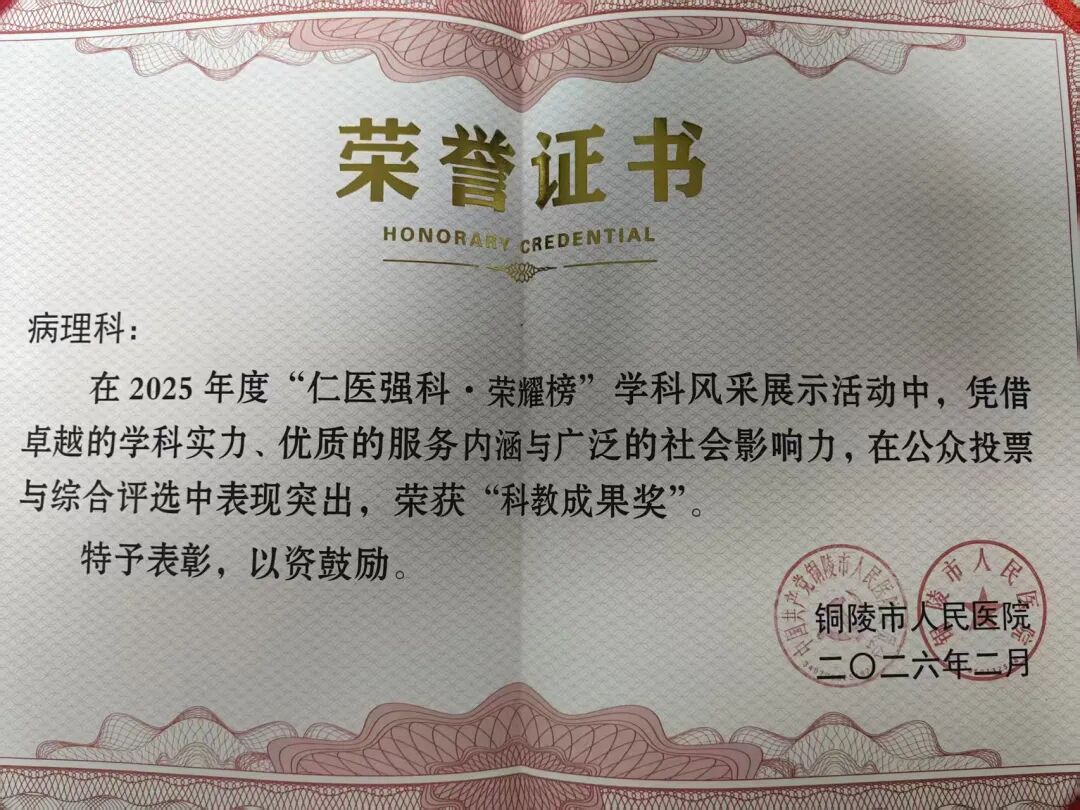 2026年2月9日下午,铜陵市人民医院2025年度“仁医强科.荣耀榜”学科表彰大会隆重举行。医院会议礼堂掌声雷动,气氛热烈,来自全员班组长以上员工300多人参加会议,共同见证荣耀时刻。病理科凭借卓越的学科实力、优质的服务内涵与广泛的社会影响力,在公众投票与综合评选中,表现突出,在2025年度“仁医强科.荣耀榜”学科风采展示活动中,荣获”科教成果奖。