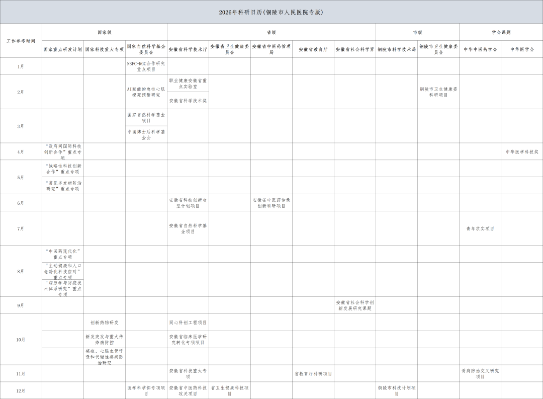为深入落实《安徽省贯彻落实国家中长期科学与技术发展规划(2021-2035年)实施方案》,加快实施创新驱动发展战略,铜陵市人民医院依据2024-2025年度国内各级各类医学科研项目及成果奖申报工作开展情况进行了汇总梳理,精心编制出我省公立医院2026年科研日历(铜陵市人民医院专版),旨在建立安徽省公立医院医学科研信息共享平台,为科研人员提供高效便捷的科研信息服务,助力我省医学科技创新和医学人才培养,为健康安徽建设贡献一份力量。(说明:本日历是在综合2024-2025年各事项时间进度的基础上编制,仅供参考)